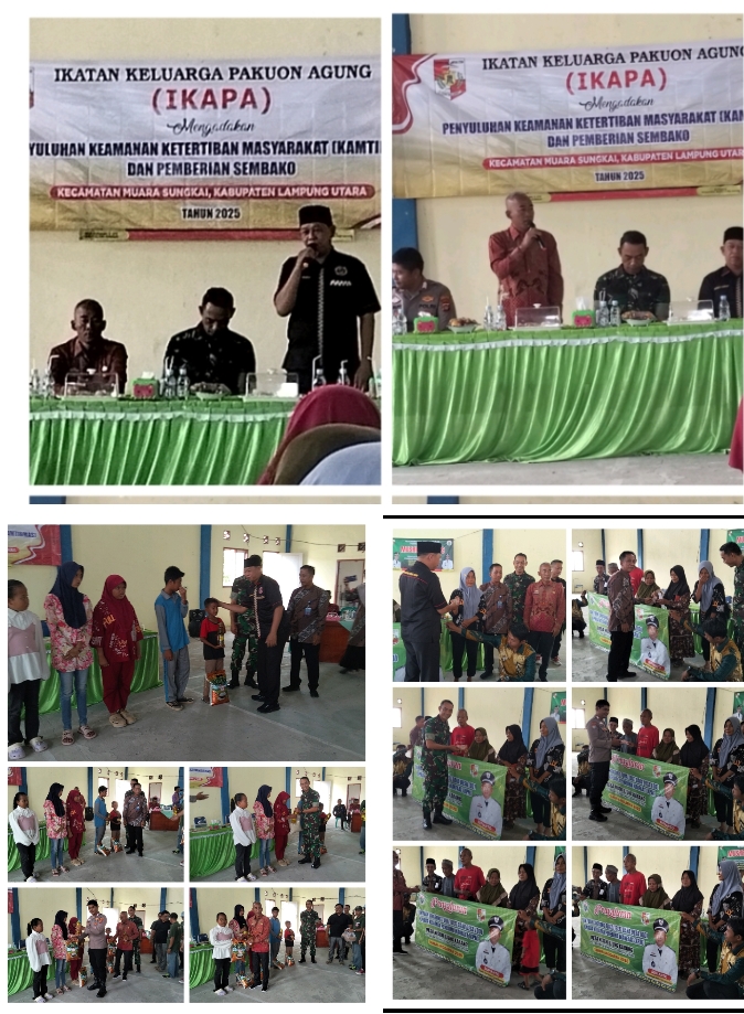 HUD HUD LAMPUNG Utara,Ikatan Keluarga Pakuon Agung (IKAPA) Mengadakan kegiatan Penyuluhan Keamanan Ketertiban Masyarakat (Kamtibmas) dan pemberian sembako kepada masyarakat Desa Negri ujung karang Kecamatan Muara Sungkai Kabupaten Lampung Utara.yamg dilanjutkan pembagian BLT DD oleh kepala desa negri ujung karang,di ikuti Ketua IKAPA,Sekcam,Danramil Sungkai Selatan, Kapolsek di wakili Davit. Jum,at (14/11/2025).