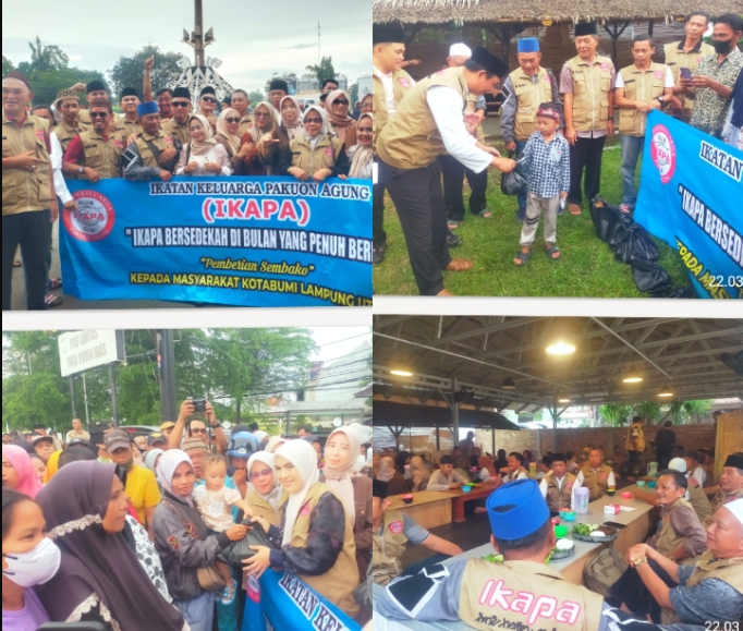 Di mulai dengan pembagian sembako secara simbolis di lakukan istri dari wakil bupati Betty Vivi Yanti di berikan kepada beberapa warga kotabumi lampung utara yang melintas di seputaran tugu payan mas dan di ikuti seluruh jajaran pengurus IKAPA.