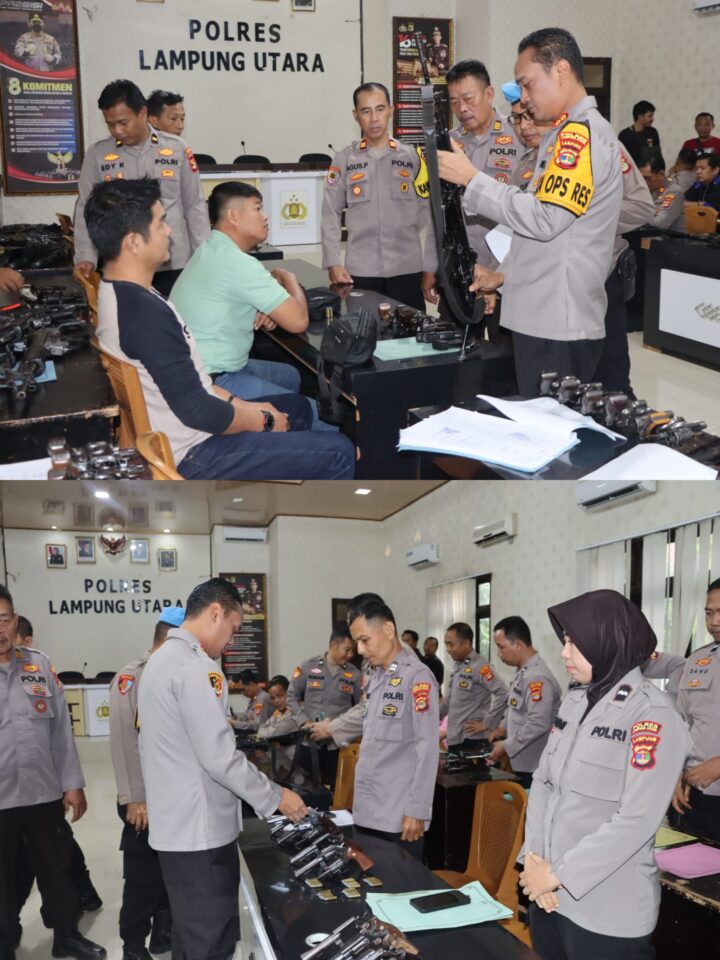 Lampung Utara – Kapolres Lampung Utara AKBP Deddy Kurniawan, S.H., S.I.K., M.M., M.Si. melaksanakan pengecekan senjata api (senpi) milik Dinas, kegiatan tersebut berlangsung di Aula Rekonfu Polres setempat. Jumat (6/3/2026).
