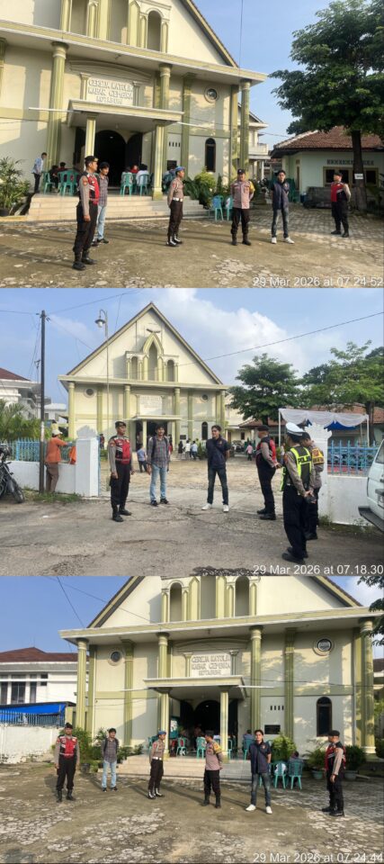 . Co Jajaran Polres Lampung Utara melaksanakan pengamanan kegiatan ibadah Palma (Perayaan Masuknya Yesus Kristus ke Yerusalem) yang berlangsung di Gereja Katolik Kabar Gembira Kotabumi, Minggu (29/3/2026) pagi.