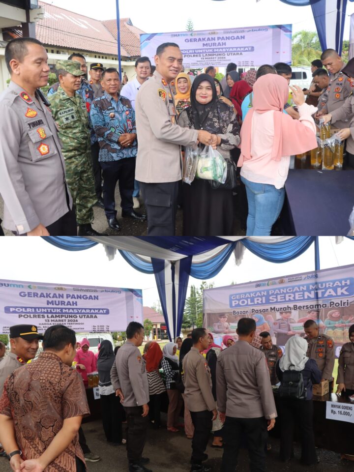 HUD HUD -Ajoi-Lampung Utara – Sebagai bentuk kepedulian terhadap masyarakat, Polres Lampung Utara menggelar kegiatan Gerakan Pangan Murah atau pasar murah secara serentak di halaman Mako Polres setempat, Jumat (13/3/2026).