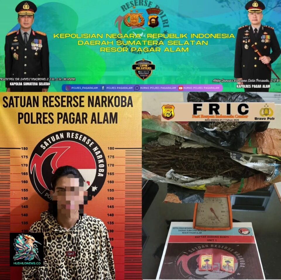 Dalam mengungkap kasus tindak pidana narkotika jenis ganja ini berhasil mengamankan satu orang tersangka berinisial PG beserta barang bukti seberat 800 gram di wilayah Kecamatan Dempo Utara, Kota Pagar Alam, Rabu 8/4/2026.