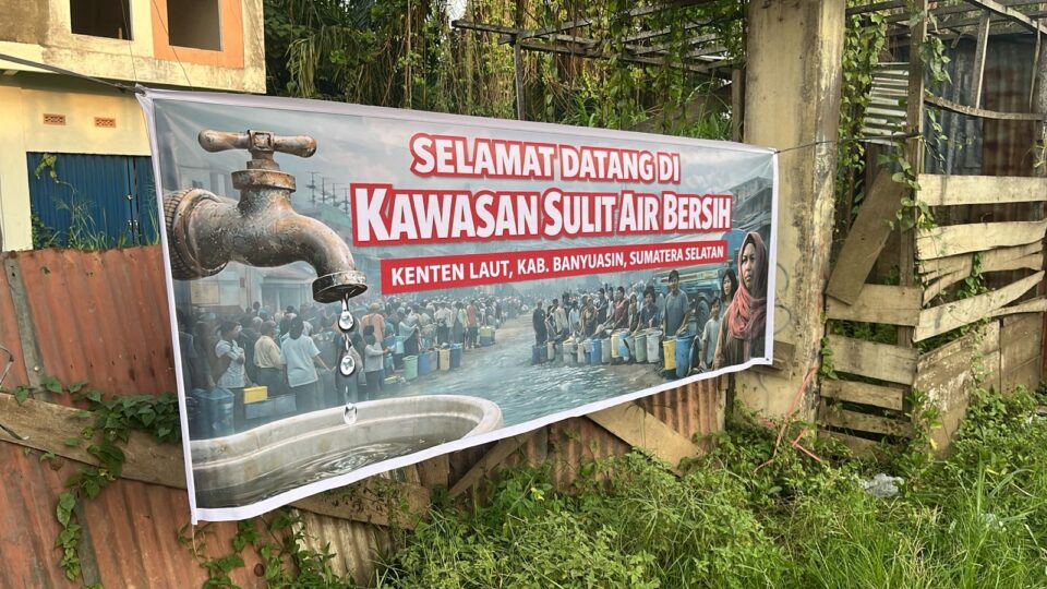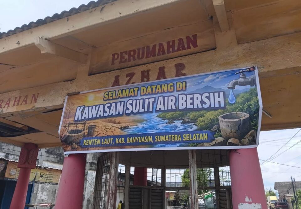 ” SELAMAT DATANG DI KAWASAN SULIT AIR BERSIH”. Terkait protes masyarakat kepada pelayanan PERUMDA Tirta Betuah dan Pemkab Banyuasin yang dinilai lamban dan abai selama belasan tahun tidak memenuhi kebutuhan warga sehari hari.