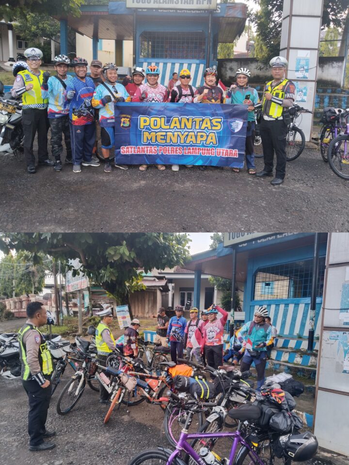 Lampung Utara — Personel Satuan Lalu Lintas Polres Lampung Utara melaksanakan kegiatan Polisi Menyapa dengan memberikan himbauan keselamatan berlalu lintas kepada komunitas pengendara sepeda onthel di Bundaran Alamsyah, Sabtu (11/4/2026).
