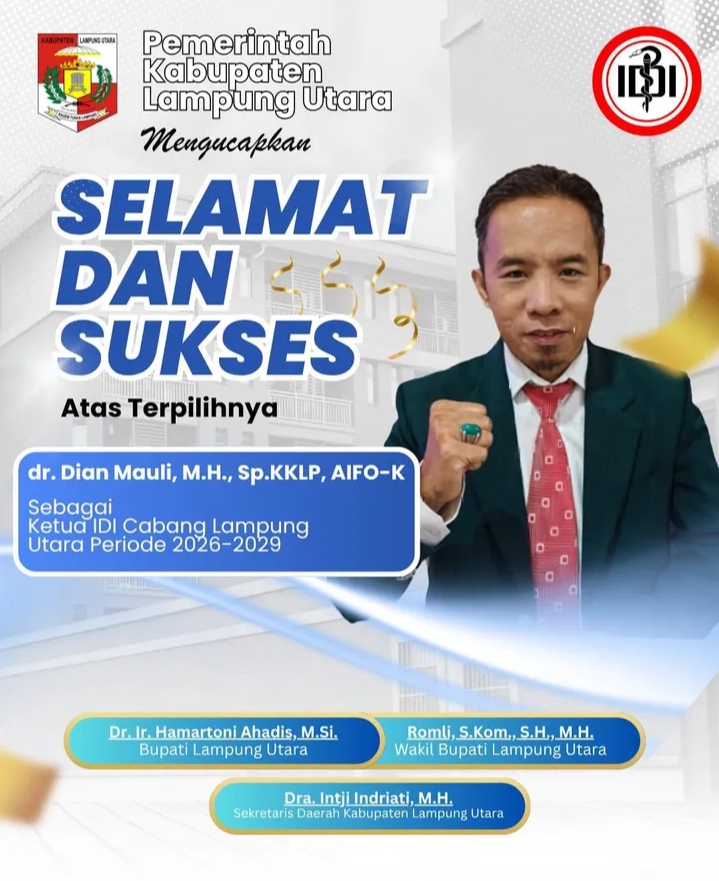 Hudhudnews.co AJOi Lampung Utara -Selamat dan sukses atas terpilihnya dr. Dian Mauli, M.H., Sp.KKLP., AIFO-K sebagai Ketua Ikatan Dokter Indonesia Cabang Lampung Utara periode 2026–2029.